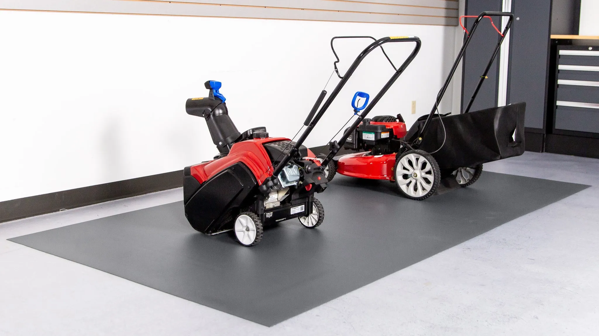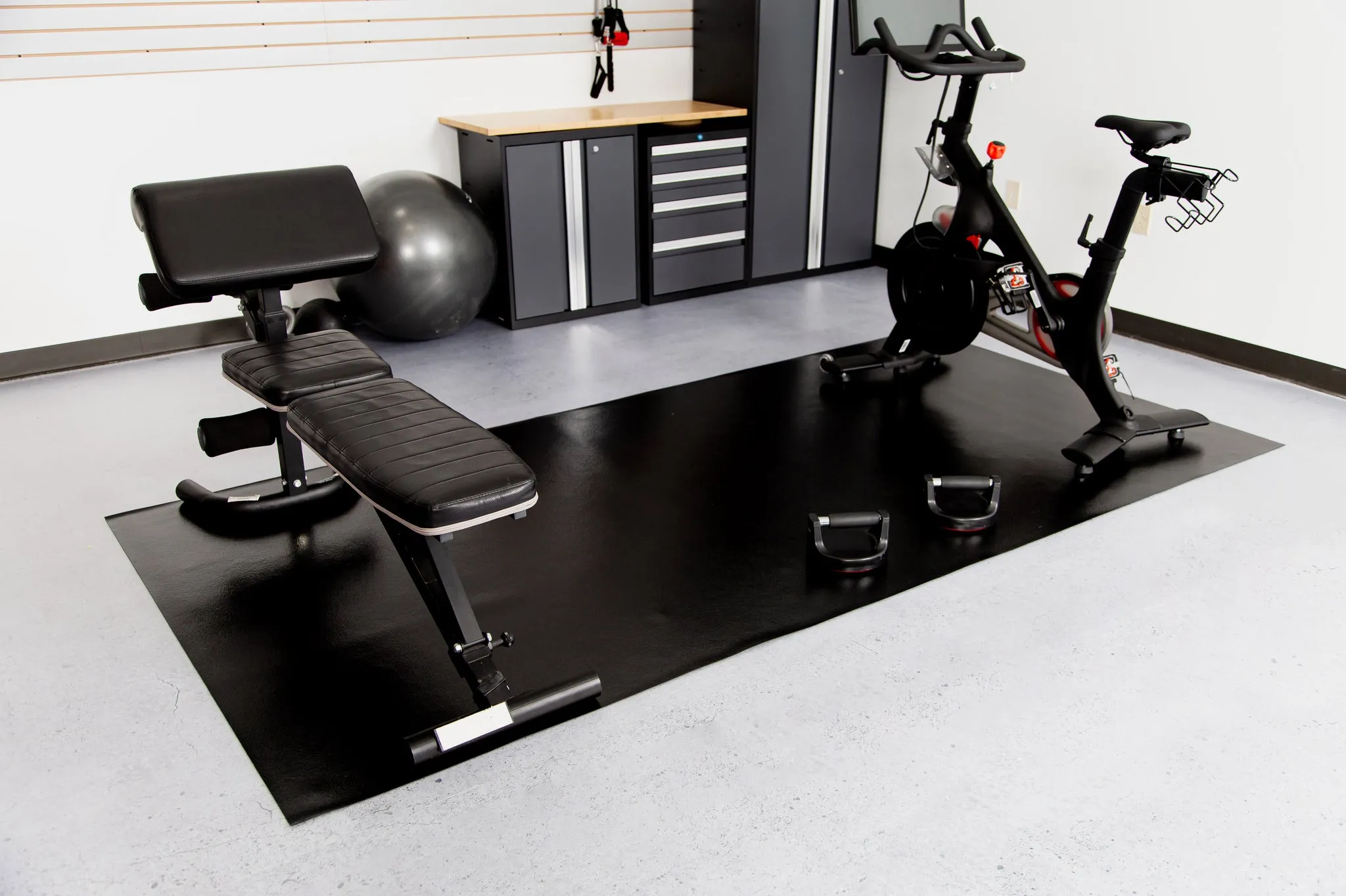 Roll-out garage mat for epoxy and polished concrete floors. Solid polyvinyl construction protects against scratches, chemicals, hot tires, and daily wear, while subtle ceramic texture adds slip resistance and a modern, low-glare finish.