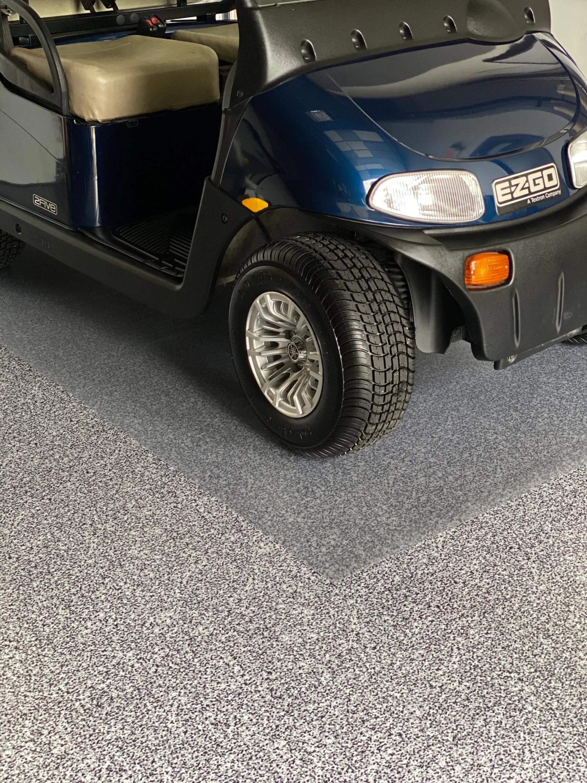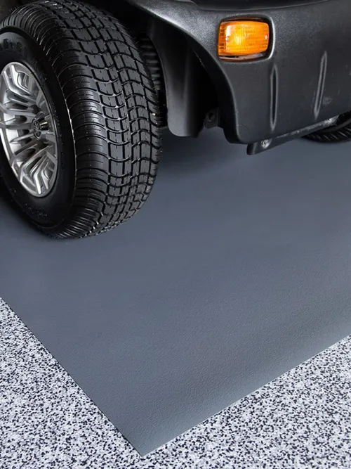 Durable garage floor mat for golf carts and small vehicles. Protects against tire marks, spills, dirt, and battery acid, providing a non-slip, easy-to-clean surface that extends floor life and ensures safe footing.